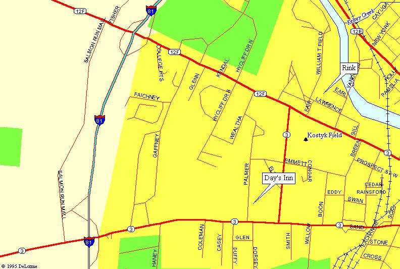 Day's Inn access road to traffic light at NY 12F. Turn right, go several blocks, and turn